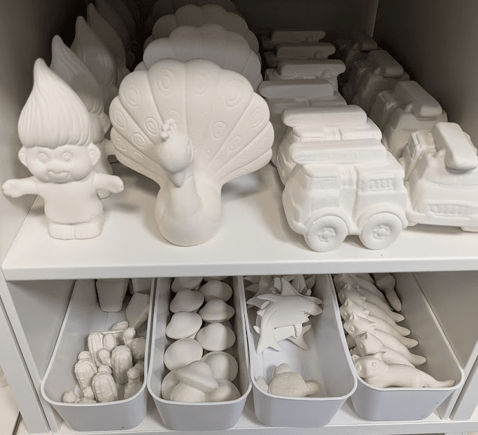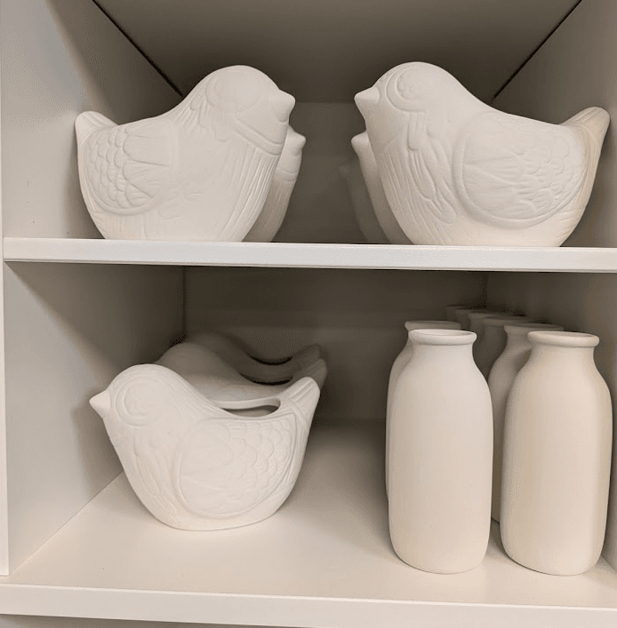 Most of our bisqueware is low-fire, making it a perfect playground for Stroke & Coat or Elements glazes. Stroke & Coat behaves like paint. It stays put, layers beautifully, and loves fine details. Feeling looser? Elements glazes flow and blend for a more organic, run-together finish. Pick your vibe and let the kiln handle the magic. Shelf pictures of the low-fire items below. Stock changes – pictures updated on 1/17/2026.