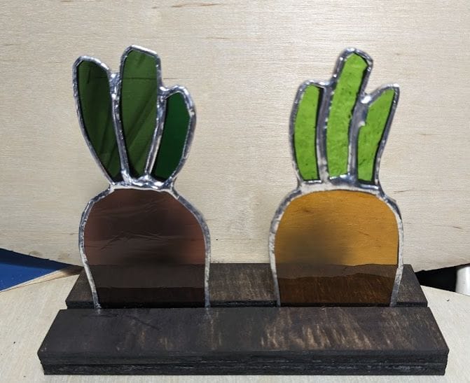 Two stained-glass carrots in a stained wooden base. Artisanal orange and purple carrots with green leaves.