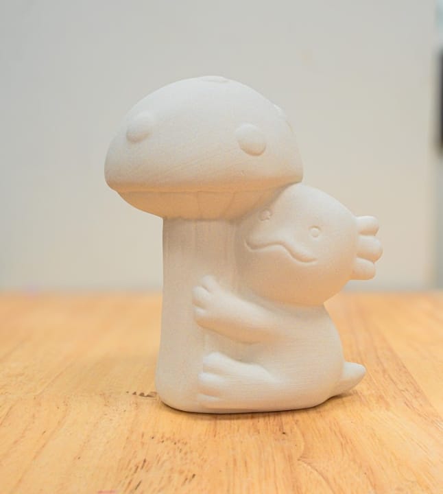 Cuteness overload! This whimsical ceramic features an adorable axolotl wrapped around a mushroom, just waiting for your colorful touch. Whether you go natural, pastel, or totally fantastical, this piece is perfect for glazing fans of all ages. Great as a desk buddy, gift, or little burst of joy on your shelf!