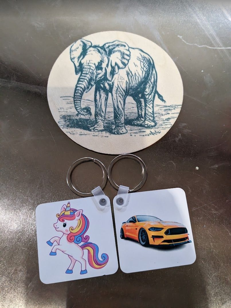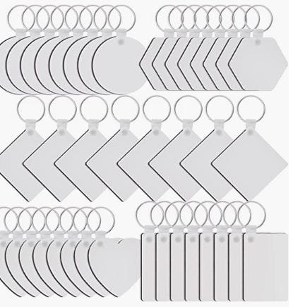Approximately 2 inch blank keychains for sublimation printings.  Various shapes, including circle, hexagon, square, heart and rectangle.